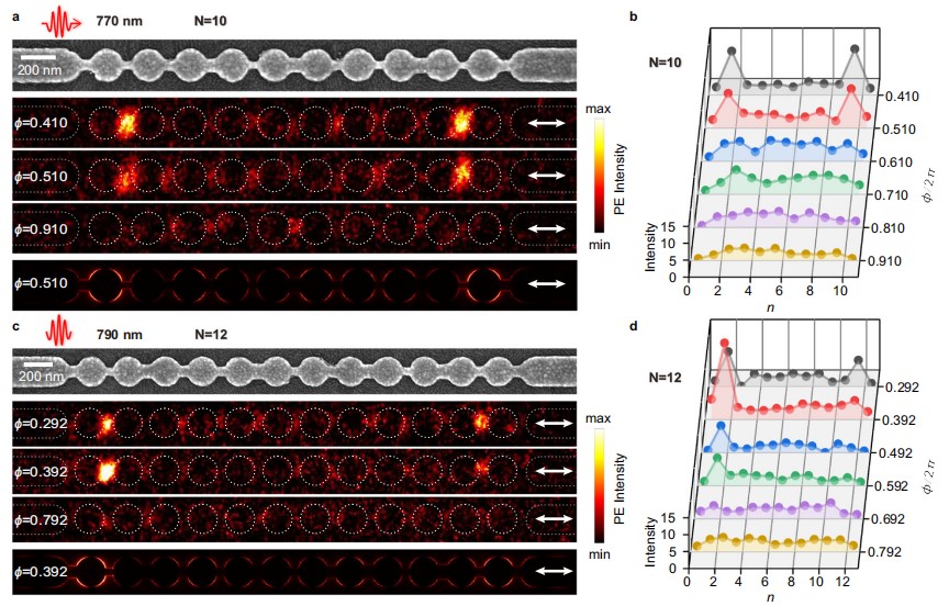 图3:拓扑边界态模式演化的PEEM近场图像。a.金纳米盘个数为10时,SEM图、超高空间分辨的PEEM近场图像和纳米链仿真结果;b.随参数ϕ值变化的每个纳米盘间隙等离激元模式光发射强度。c-d.金纳米盘个数为12的结果。