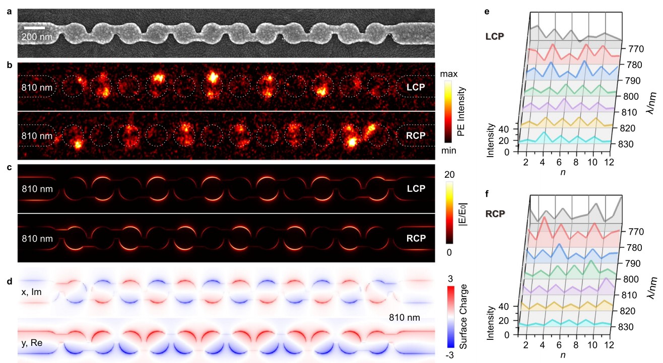 图4:具有偏振依赖性和波长依赖性的交错纳米链PEEM近场图像。a.交错纳米链SEM图;b.在LCP和RCP分别激发下,交错纳米链的PEEM近场图像;c-d.仿真结果;e-f.在LCP和RCP的分别激发下,实验中每个纳米盘的波长依赖近场光发射强度。