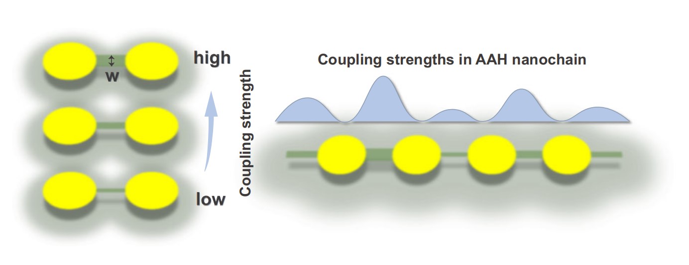 拓扑光子学在集成光子器件和信息处理芯片领域展现出巨大的应用潜力(例如研究团队前期工作:Nano lett. 21, 9270 (2021);Nanophotonics 13, 1397 (2024)),其中,Aubry-André-Harper(AAH)模型为探索新物理现象和实际应用提供了理想平台。然而,将等离激元AAH拓扑绝缘体集成到芯片上面临着两大挑战:一是对样品中格点之间的耦合强度的制备精度的要求非常严格,二是等离激元纳米结构间隙中的热点效应严重干扰近场测量。针对这一现状,研究团队提出了一种新方法,通过在金纳米盘之间引入不同宽度的短波导,来精确调控金纳米盘之间的耦合强度,并构建AAH纳米链(图1)。