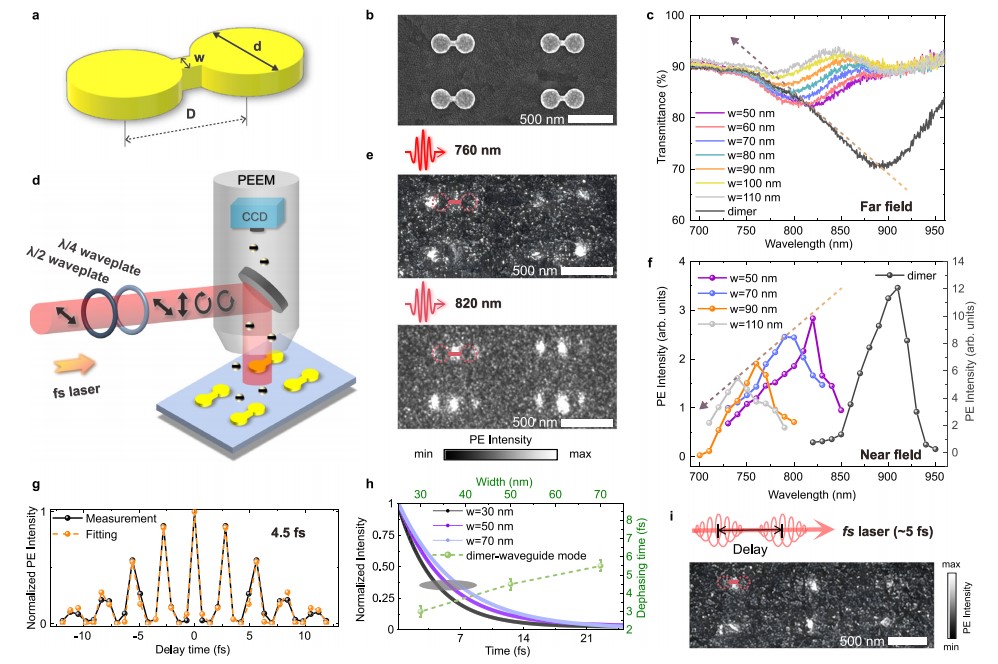 图2:等离激元金纳米盘-波导结构的超高时空分辨PEEM测量结果。a.结构示意图;b.扫描电子显微镜(SEM)图;c.不同结构的透射光谱;d. PEEM实验装置示意图;e.PEEM表征的近场模式;f.近场光谱;g.PEEM测量的模式退相干时间;h.不同结构的模式退相干时间及仿真结果;i.5 fs脉冲光激发下的金纳米盘-波导结构的近场图像。