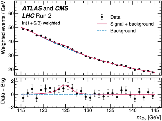 图1: ATLAS和CMS实验报告希格斯→Z+光子衰变首个证据的期刊论文的Z+光子质量谱。