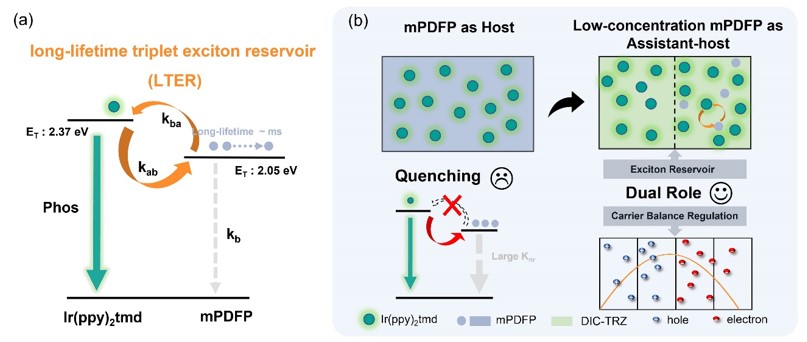 图1. a)低能三重态分子与发光分子之间的能量传递机理。b)低能三重态分子在发光层中分别作为主体和辅助主体的作用。