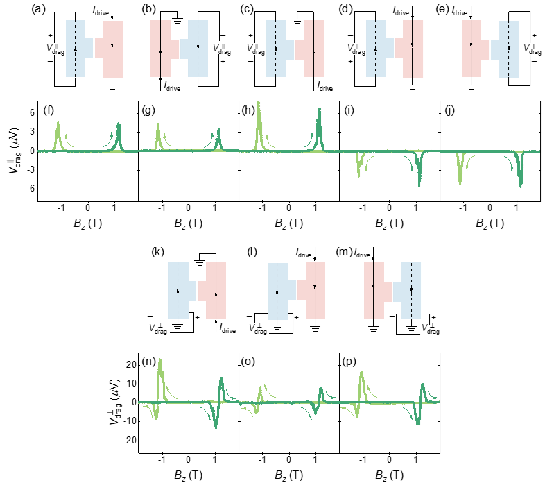 图1:纵向和横向库伦拖曳的非互易性。(a-e)不同的纵向库伦拖曳测量电路配置。(f-j)样品温度为20 mK的纵向库伦拖曳电压。(k-m)不同的横向库伦拖曳测量电路配置。(n-p)样品温度为20 mK的横向库伦拖曳电压。