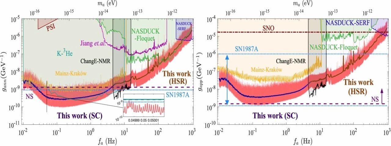 图1:轴子暗物质与中子(左)和质子(右)耦合强度的实验测量限制。横轴表示暗物质质量对应的康普顿频率。红色线为本次ChangE合作组的研究结果,包括混合自旋HSR模式以及自补偿SC模式。