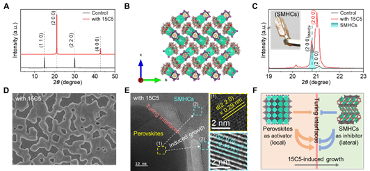 图2:超分子冠醚诱导的“超分子杂化晶体”与“图灵结构钙钛矿”混合物质系统(晶体学和形貌学)。
