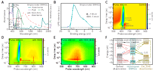 图3:光电子能谱和飞秒瞬态吸收光谱等表征揭示界面电子跃迁新机制(物理学机制)。