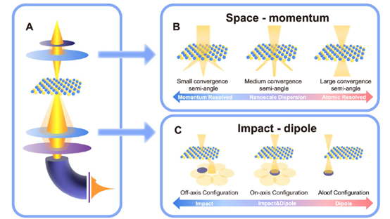 在STEM-EELS技术中,空间分辨率与动量分辨率受电子束会聚半角(α)和加速电压等核心参数制约。α是关键调控参数:小α可实现优于0.1nm⁻¹量级的动量分辨率,但空间分辨率降至微米尺度;大α使电子束聚焦至原子尺度,但动量分辨率严重退化。优化α至中间值,可在维持纳米级空间分辨率的同时,获得nm⁻¹量级的动量分辨率,实现对纳米材料声子色散特性的精准测量。