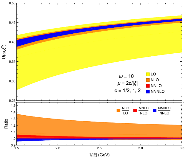 图2:领头阶(LO)、次领头阶(NLO)、次次领头阶(NNLO)、次次次领头阶(N3LO)下的夸克关联函数的预测值和理论误差