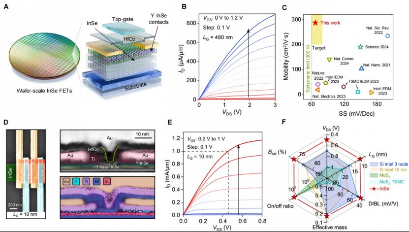 欧冠官方网站凝聚态物理与材料物理研究所刘开辉教授课题组与合作者提出“固–液–固”材料制备新策略,首次实现了高质量二维硒化铟(InSe)半导体晶圆的制备。该材料展现出优异的电学性能,在晶体管阵列中实现了极高的迁移率与接近玻尔兹曼极限的亚阈值摆幅,并在超短沟道(10 nm以下)器件中,其关键参数—包括工作电压、栅极长度、漏致势垒降低(DIBL)、电子有效质量、开/关比和室温弹道率等,全面优于目前最先进的英特尔3纳米节点技术。2025年7月18日,相关成果以“用于集成电子学的二维硒化铟晶圆”(Two-dimensional indium selenide wafers for integrated electronics)为题,在线发表于《科学》(Science)。