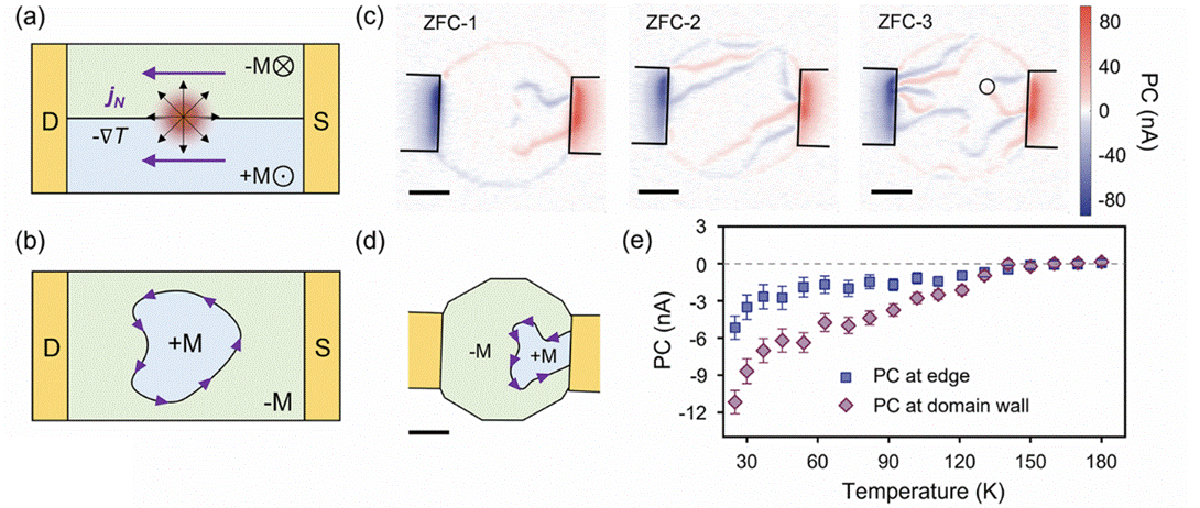 图1 | 基于光致反常能斯特效应的Co3Sn2S2中磁畴显微成像研究。a,磁畴边界反常能斯特效应引起光电流响应示意图。b,随机磁化形成磁畴分布c,不同随机磁化下磁畴成像效果d,根据c中结果得到样品磁畴分布e,光电流响应的温度依赖关系