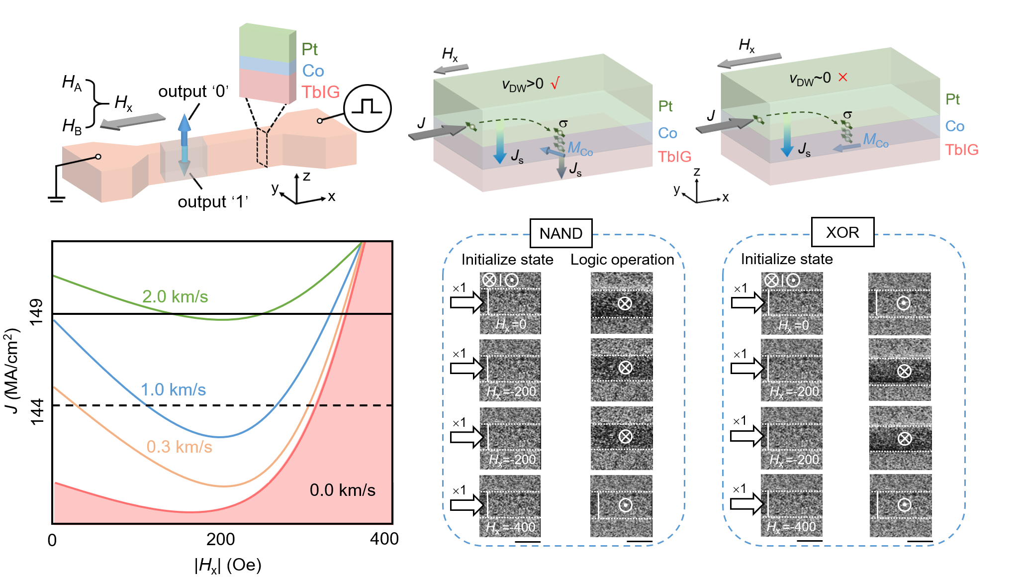 在这项工作中,研究团队外延生长了具有垂直磁各向异性的高质量稀土铽铁石榴石(TbIG)薄膜,并构建了重金属铂/铁磁金属钴/TbIG异质结构(图1)。利用铁磁金属与亚铁磁绝缘体的磁耦合作用,畴壁运动速度最快可以达到3.7 km/s。此外,利用钴层的自旋过滤效应,研究团队在畴壁速度对于磁场的响应中引入非单调性。根据与磁场和电流有关的独特速度相图,研究团队提出了一种设计可执行多种布尔逻辑运算的畴壁逻辑器件的原理。通过调整电流和初始磁化状态,在单个畴壁逻辑器件中演示了所有(16种)双输入布尔逻辑运算。研究结果凸显了自旋电子系统中多功能逻辑门的可行性,并显示了其在高密度内存计算架构中的潜力。