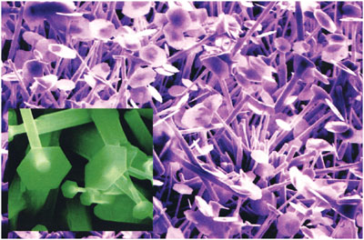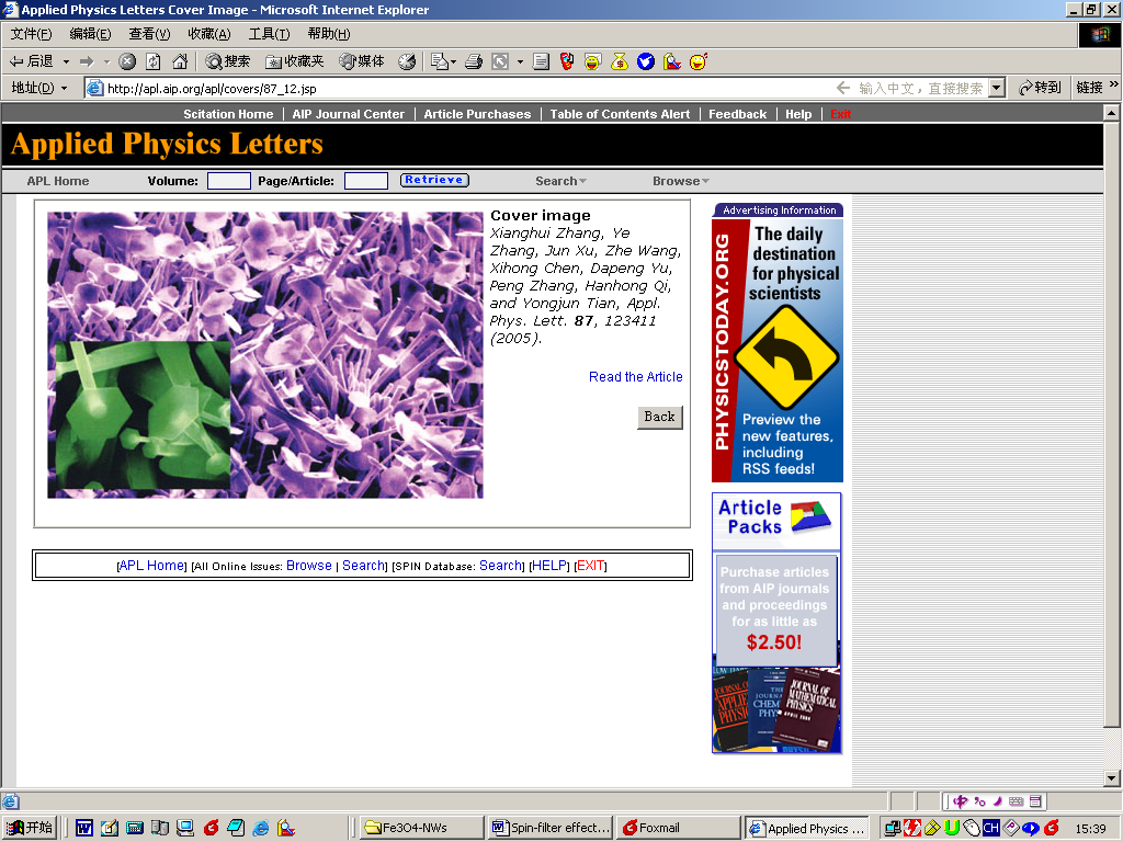 ZnO是一种直接带隙的宽禁带半导体,在紫外发光等方面有着广阔的应用前景,因而成为当前凝聚态物理研究的热点之一。俞大鹏教授研究组利用简单的热蒸发方法合成了新颖的ZnO纳米钉子和纳米管结构,该结果刊登在APPLIED PHYSICS LETTERS 87, 123111 (2005)上,并作为封面介绍。