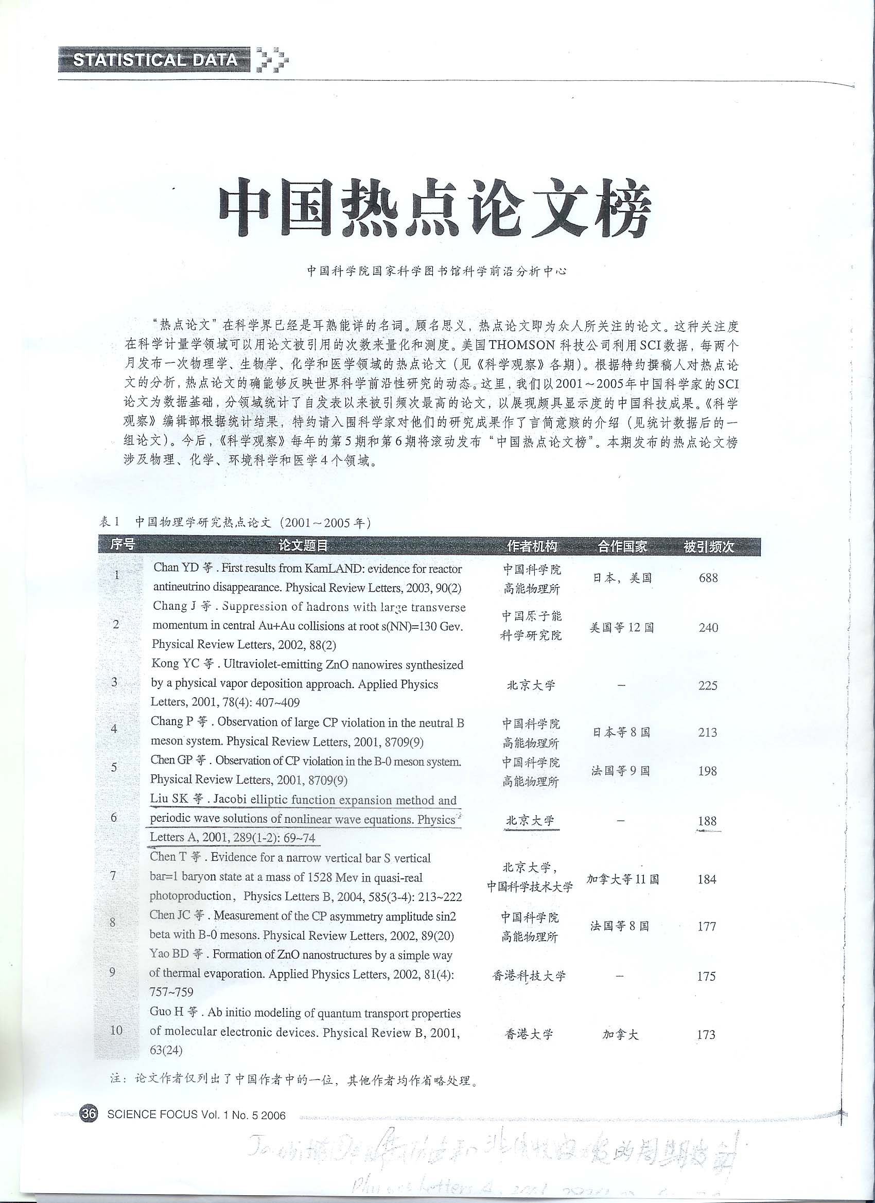 科技论文被其他同行引用的频次是衡量论文含金量的重要指标。根据中国科学技术信息研究所2006年10月27日发布的最新统计结果,在1996~2005十年间,我国学者共有22篇论文的他人引用次数超过了200次,这些论文涵盖物理、化学、材料、生物和农业等主要研究领域。今年欧冠官方网站又有5篇论文入围。其中,欧冠官方网站俞大鹏教授领导的研究团队关于ZnO纳米线的论文(Applied Physics Letters 78, 407 (2001))、刘式适教授领导的研究团队关于非线性动力学的论文(Physics Letters A 289, 69, (2001))榜上有名。这两篇论文还同时被“科学观察”(SCIENCE FOCUS 1(5), 2006) 列为2001~2005年期间“中国物理研究十篇热点论文”中的第三和第六名。上述统计结果充分反映出欧冠官方网站在相关研究领域的实力和影响。