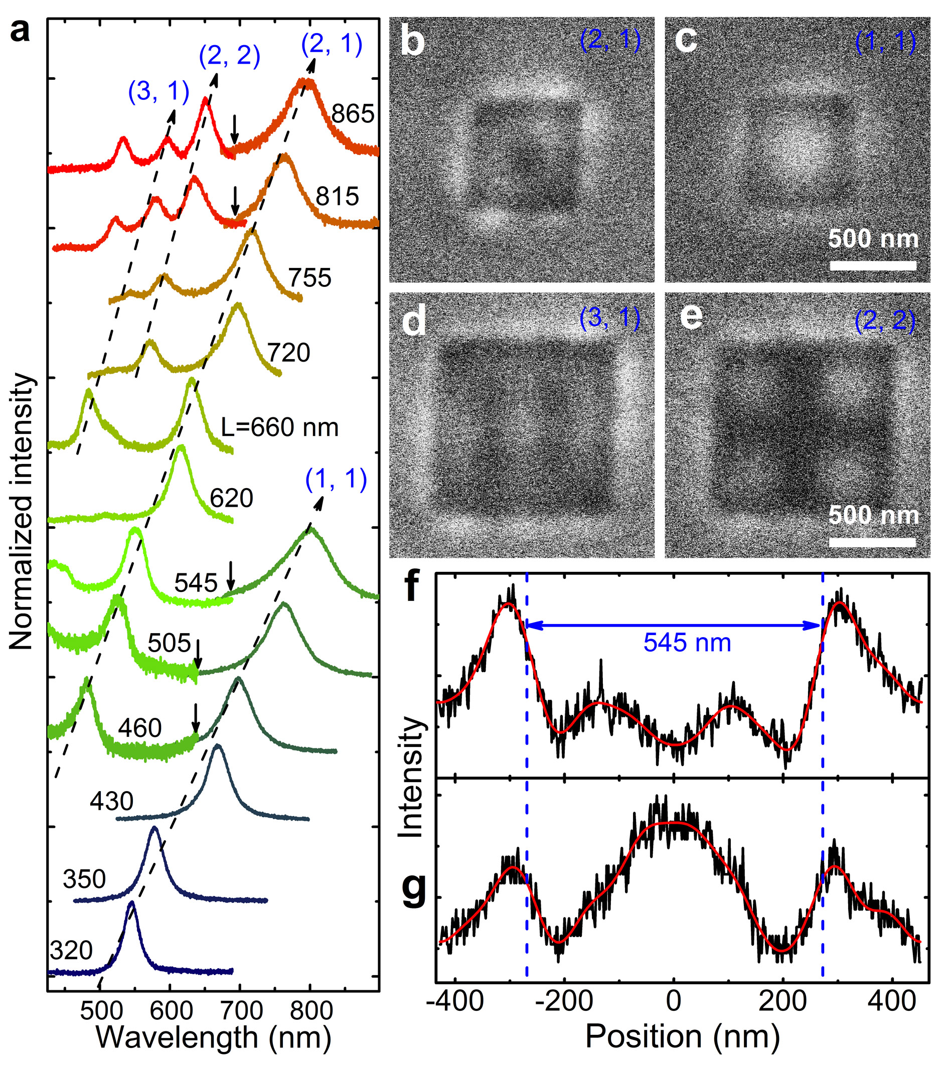 最近,俞大鹏教授和张家森教授团队合作研究,团队博士生朱新利等对围栏形的表面等离激元纳米共振腔中的模式开展了一系列研究。他们利用电子束激发纳米腔中的表面等离激元,获得了清晰的表面等离激元模式,结合理论模拟分析研究了表面等离激元的形成物理机理,发现其垂直于表面的分量决定了纳米腔中表面等离激元模式的强度分布,证明电子束局域激发表面等离激元的垂直分量。这一发现对表面等离激元的激发机理研究以及纳米腔中模式的直接探测有着重要的意义。他们还实验研究了金属反射镜的高度对表面等离激元模式的影响规律,为共振腔特性的操控提供了新的自由度。实验中利用凸起的金属墙作为反射镜,获得了比较高的品质因子和丰富的模式,具有远小于一般光学微纳腔的模体积,为进一步实现表面等离激元纳米激光器打下了基础。该结果于9月14日发表在物理学领域的顶级刊物《物理评论快报》(Physical