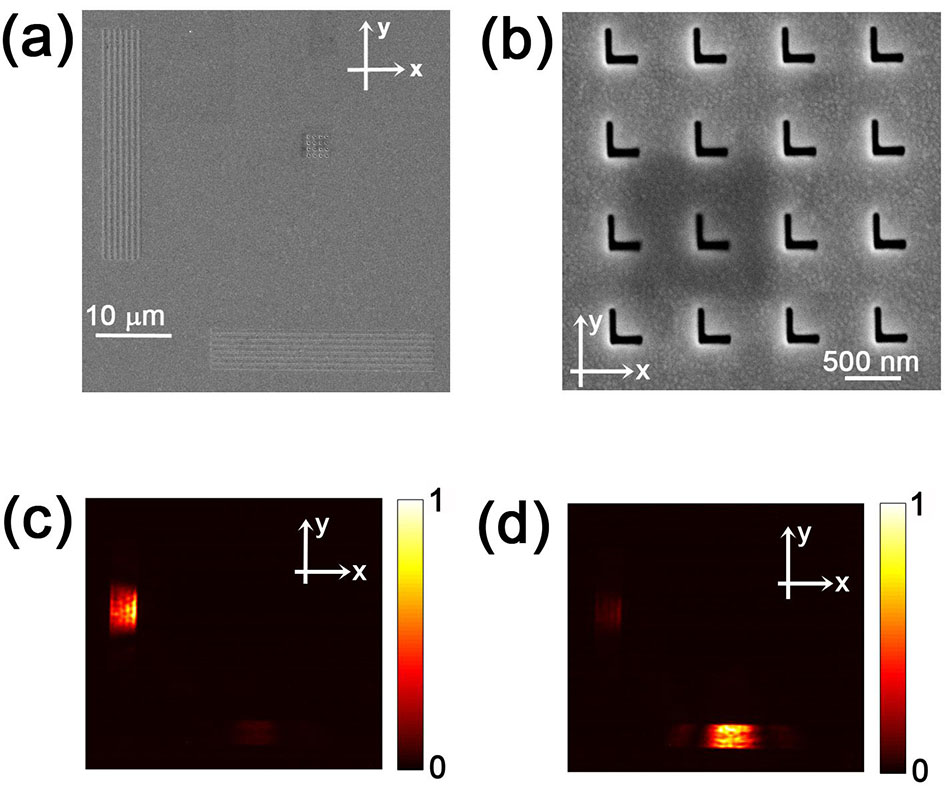 of the L-shaped optical slot nanoantenna array. (c) and (d) are CCD