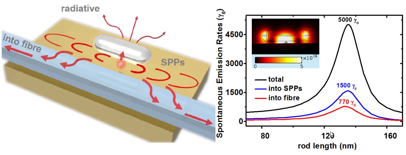 通过结合间隙表面等离激元结构中超高的光子发射率与低损耗光纤有效的提取,他们从理论上在金属纳米棒-纳米膜结构中提出了有效的单光子发射与一维纳米尺度的传导。他们发现总的光子发射加快和表面等离激元通道的光子衰减速率变快可以达到只有金属纳米膜时的几十倍。特别的,他们利用波矢匹配光纤将表面等离激元通道的单光子导出,在波导中光的衰减速率可以达到真空中的290~770倍。这种新的机制将会对基于金属的光学腔、芯片上的超亮单光子源、和芯片上的基于表面等离激元的纳米激光器等研究领域有重要影响。