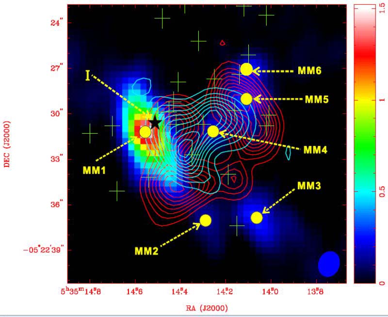 谱线,揭示了其中的外向流不是双极的而是多极的(图1),不是先前证认表明的年轻星体Source I驱动的,而是源于该区域的爆发。从而证认出猎户座KL区域的外向流是爆发性外向流。这是第一个也是迄今为止唯一的一个爆发性分子外向流。这项研究还运用Spitzer和相关红外资料证认出猎户座的爆发的中心不是先前认定的500年以前瓦解的大质量系统,而是BN大质量星(图2)。他们还第一次在这个复杂区域内的大质量源Source
