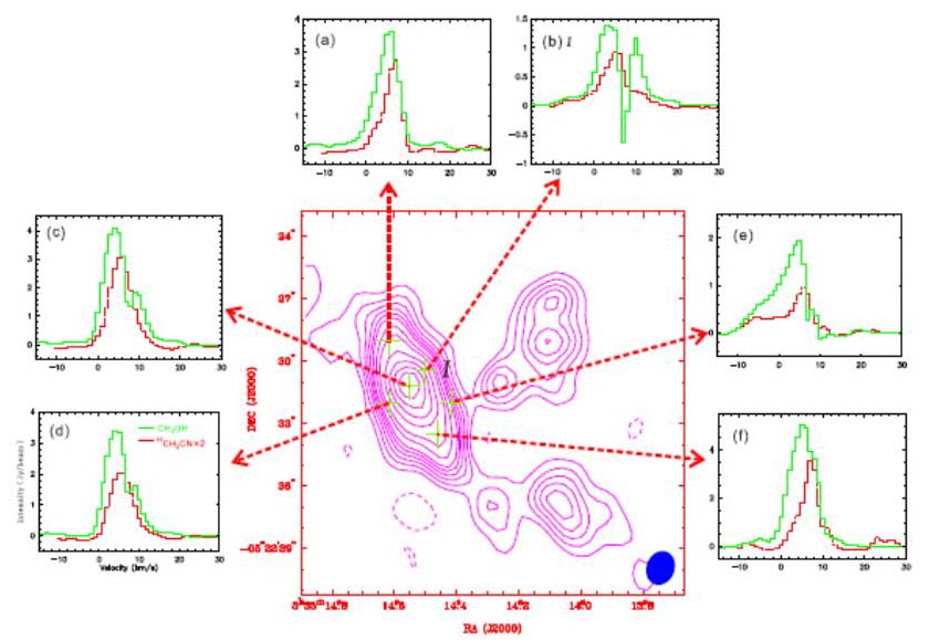 I是在引力坍缩(图3)。在热核MM1中测到的蓝色轮廓,也表明物质内流。这些结果促进了对于大质量恒星形成的认识。