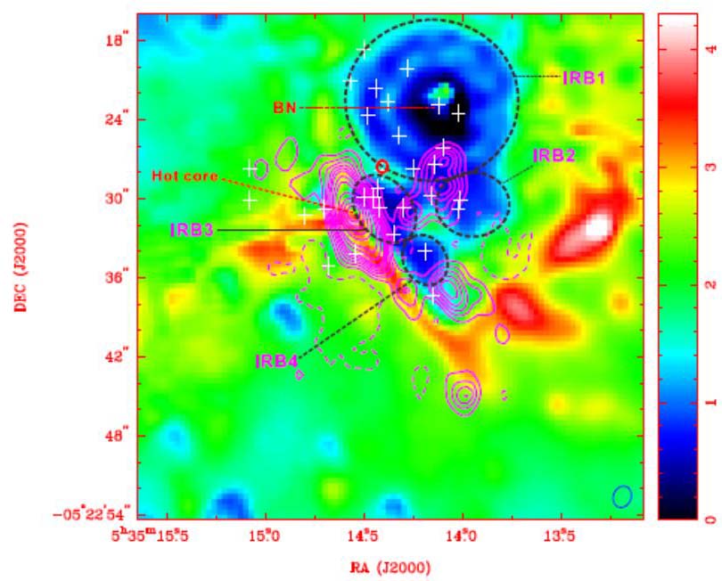 图2:猎户座中的爆发中心BN天体。由Spitzer卫星的红外资料得出的尘泡结构和激波区域。色标表示Spitzer