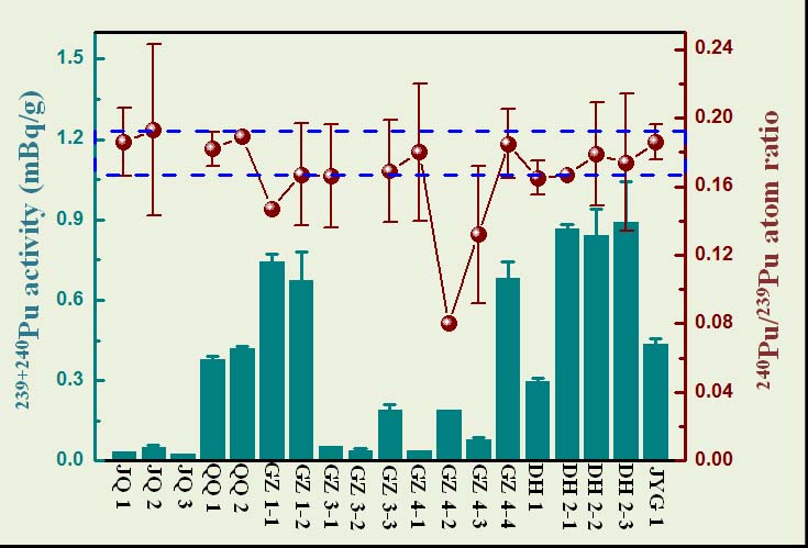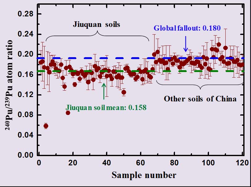 钚是与核武器和核工业密切相关的人工放射性核素,上世纪有核国家开展的大气层核试验是全球环境中存在的钚核素的主要来源。在核试验场周边地区,除了全球放射性沉降的钚以外,还存在着来自局地核试验场的贡献。郭秋菊课题组长期致力于我国环境中放射性核素的研究,近年来对我国核试验下风向甘肃酒泉地区土壤中钚核素进行系统深入研究。利用电感耦合等离子质谱法(ICP-MS)对土壤样品中钚的放射性活度和240Pu/239Pu原子比值进行了精确分析,首次报道了该地区土壤中钚的活度水平、沉积通量分布和同位素比值特征,并首次对钚核素在我国土壤中的迁移速率进行了实测和预测。
