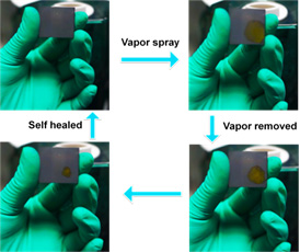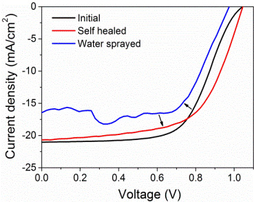 图:聚合物骨架钙钛矿太阳能电池结构示意图;电池光伏性能的自修复I-V曲线;钙钛矿薄膜在被水汽破坏后一分钟内的自修复展示照片,薄膜回复到初始状态。