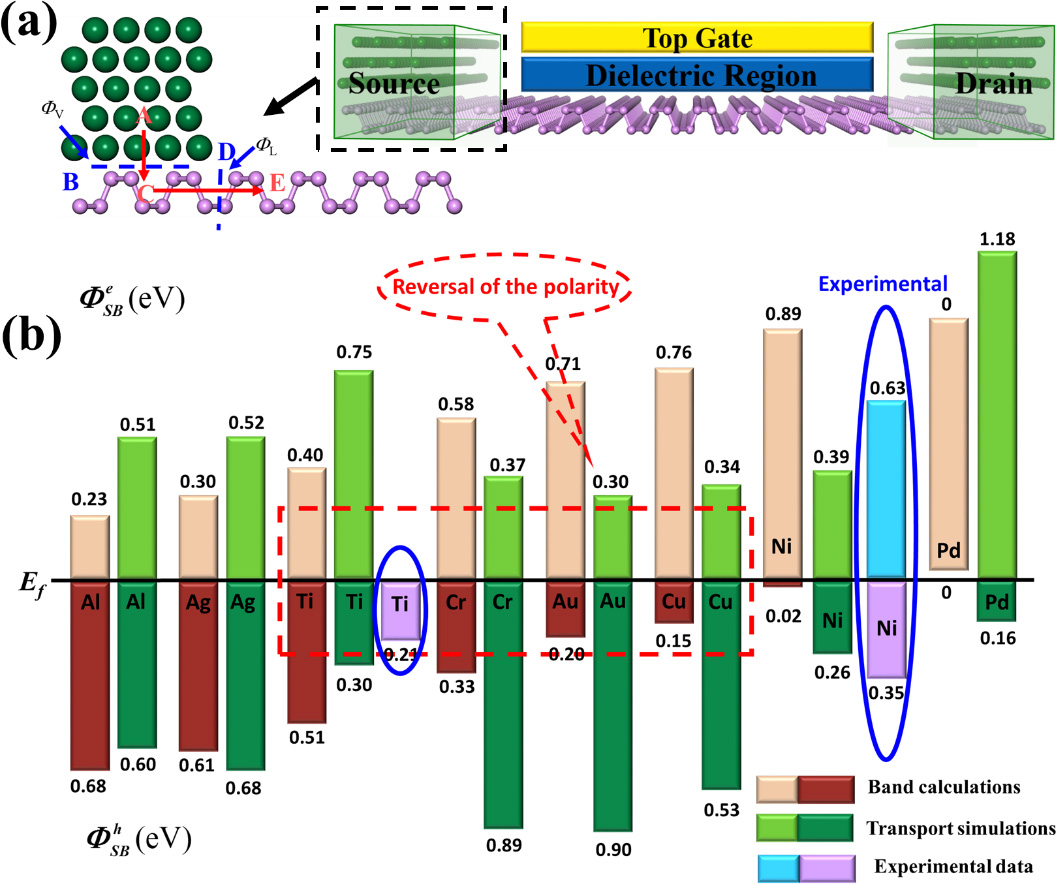 和E代表三个区域,B和D代表两个界面,红色箭头代表了电子或空穴从接触金属到沟道的注入路径;利用第一性电子结构计算,量子输运模拟和实验测量三种方法,单层磷烯-金属Al,