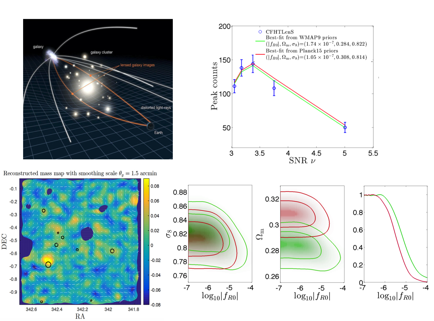 在本工作中,结合最新的宇宙微波背景观测结果,该研究团队对CFHTLenS弱引力透镜观测数据进行了详尽的分析,首次利用弱引力峰值统计方法对”Hu-Sawicki