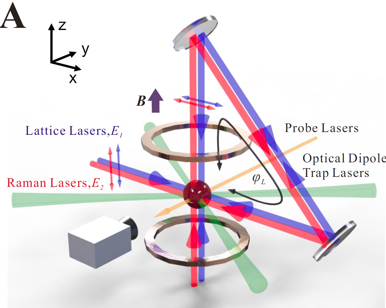 图1:二维自旋轨道耦合和拓扑能带实现示意图。在激光场的作用下,原子在光晶格中发生自旋翻转的量子隧穿,导致自旋轨道耦合。