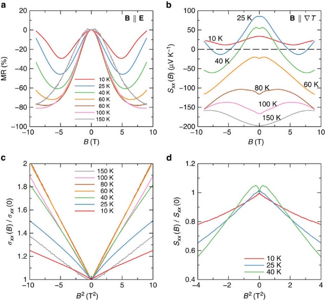 左图a为平行磁场下的负磁阻效应,图b为磁热电势结果,图c为负磁阻与磁场的二次关系,图d为热点势