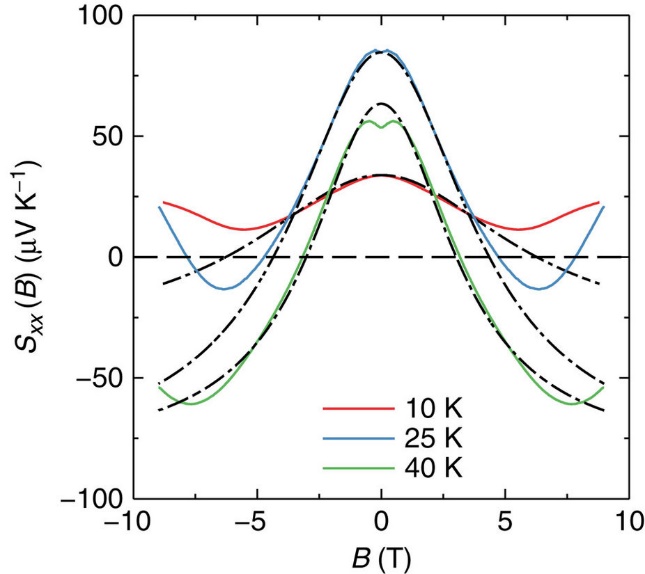 与磁场的二次关系;右图为低温10K、25K、40K,平行磁场下热电势是实验结果与理论结果的对比图
