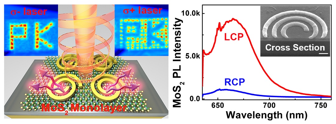 表面等离激元是外界光激发下金属表面自由电子集体震荡现象,是光子和电子相互作用形成的表面电磁场元激发共振模式,可产生局域电磁场增强、共振吸收、热电子掺杂等效应,进而实现对新型低维纳米材料光激发的动态调控。欧冠官方网站方哲宇课题组通过操控金属纳米螺旋结构中光的自选轨道耦合效应,实现了对单层MoS2荧光强度的动态调控,该研究成果近期发表在国际期刊ACS