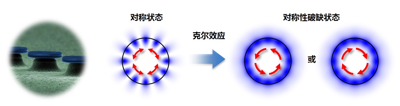 左:实验用片上微腔;右:对称性破缺前后腔内行波方向及光场分布。