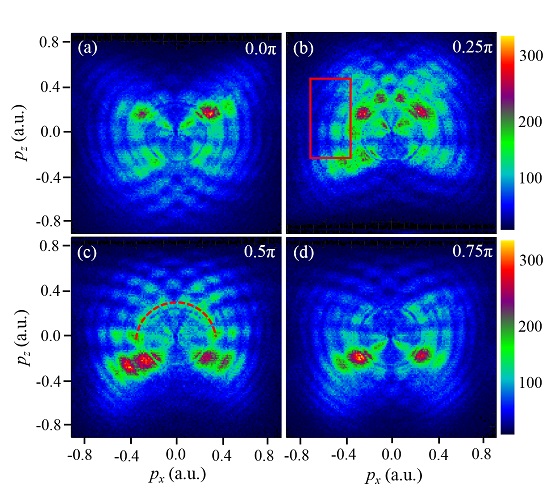 1),探测电子在遂穿过程中获得势垒下相位,揭示电子隧穿的动力学信息。该工作利用先进的冷靶反冲离子电子动量成像谱仪(所谓COLTRIMS),清晰地测量了正交双色光场下的光子周期内干涉图案(图2)。通过与理论模拟的对比
