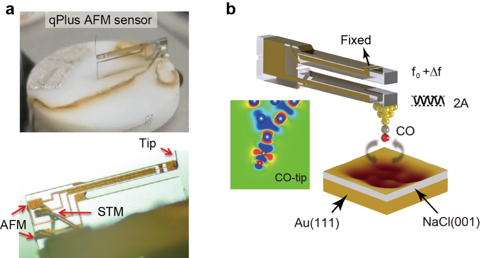 江颖课题组长期致力于超高分辨的扫描探针显微镜系统的研制和开发,近年来在表面水的结构和动力学研究中取得了国际领先的研究成果。然而,由于隧道电子的激发以及针尖-水分子之间的相互作用力,扫描探针不可避免地会对弱键合的水分子结构产生扰动。在这个工作中,江颖等发展了新一代基于qPlus的非接触原子力显微镜(nc-AFM)技术,自行制作了高性能qPlus型原子力传感器(图1),解决了AFM和STM双模式扫描的关键技术问题,实现了飞安级电流和皮牛级力信号的同时探测,将针尖-样品之间相互作用力的探测灵敏度推向了极限。