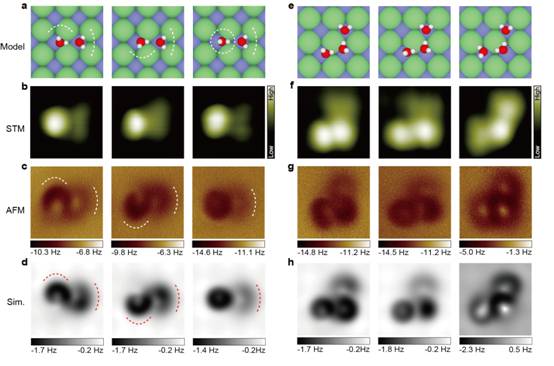 | 图2:各种亚稳态的水二聚体(a-d)和三聚体(e-h)的亚分子级分辨成像。AFM图中弯曲的暗环来源于水分子氢原子的静电势分布,据此可以确定氢原子的取向。