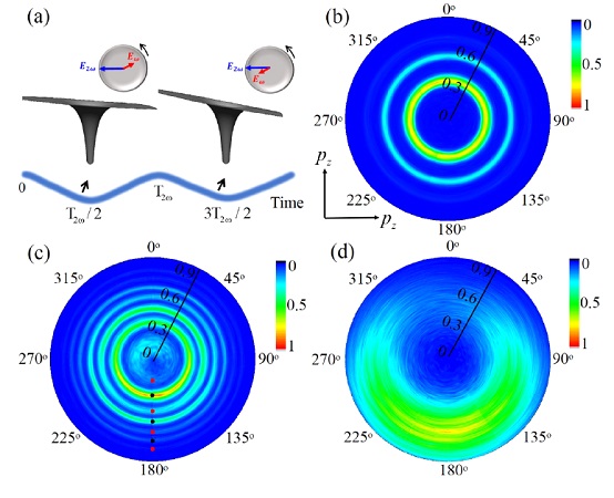 119,073201],其中弱的基频光ω做“时针”,强的二倍频2ω为阿秒钟的“分针”,打破了圆对称性,这种相互作用构型类似于空间旋转的时域双缝干涉仪(图1a),可从电子干涉谱上可提取阿秒时间尺度电子动力学信息。
