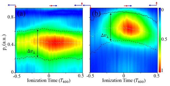 | 图2. 实验提取的时间分辨的电子波包动量分布。800nm光场强度分别为(a)0.0045a.u.和(b)0.02a.u.,