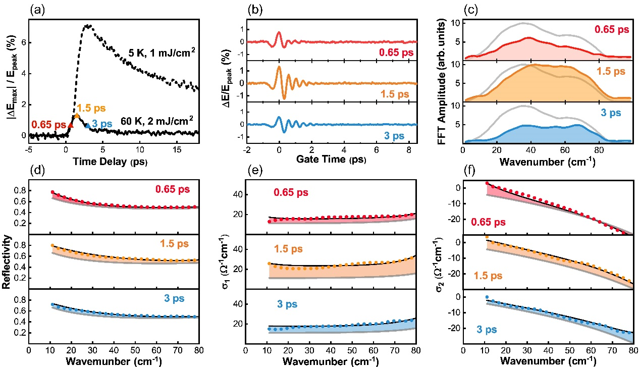 图2 YBa2Cu3O6.55正常态对近红外泵浦光激发的非平衡态光学响应。(a)体系的泵浦-探测弛豫过程。(b-c)泵浦后不同时间延迟样品反射太赫兹电场在时域和频域上的变化。(d-e)不同时间延迟的非平衡态光学性质。 |