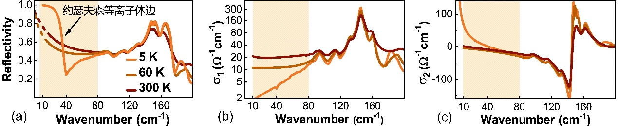 图1 铜氧化物高温超导体YBa2Cu3O6.55(Tc= 55 K)沿晶体 c 轴方向的平衡态光学性质。(a)反射谱,(b)电导率实部,(c)电导率虚部。样品在60 K和300K是处在正常态,5K是超导态。 |