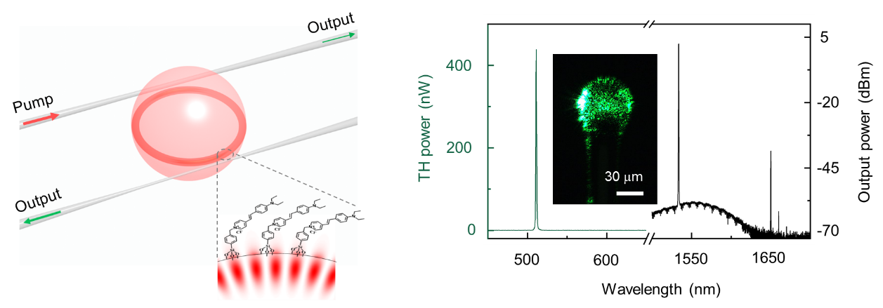左图:二氧化硅微腔表面修饰有机共轭分子;右图:实验测得的激发光和三次谐波光谱图