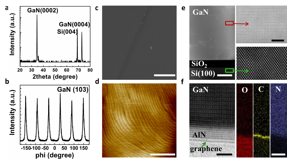 沈波和杨学林课题组创造性地使用单晶石墨烯作为缓冲层,在Si(100)衬底上实现了单晶GaN薄膜的外延生长,并系统研究了石墨烯上GaN外延的成核机理和外延机制。该突破不仅为GaN器件与Si器件的集成奠定了科学基础,而且对当前国际上关注的非晶衬底上氮化物半导体外延生长和GaN基柔性器件研制具有重要的指导价值。
