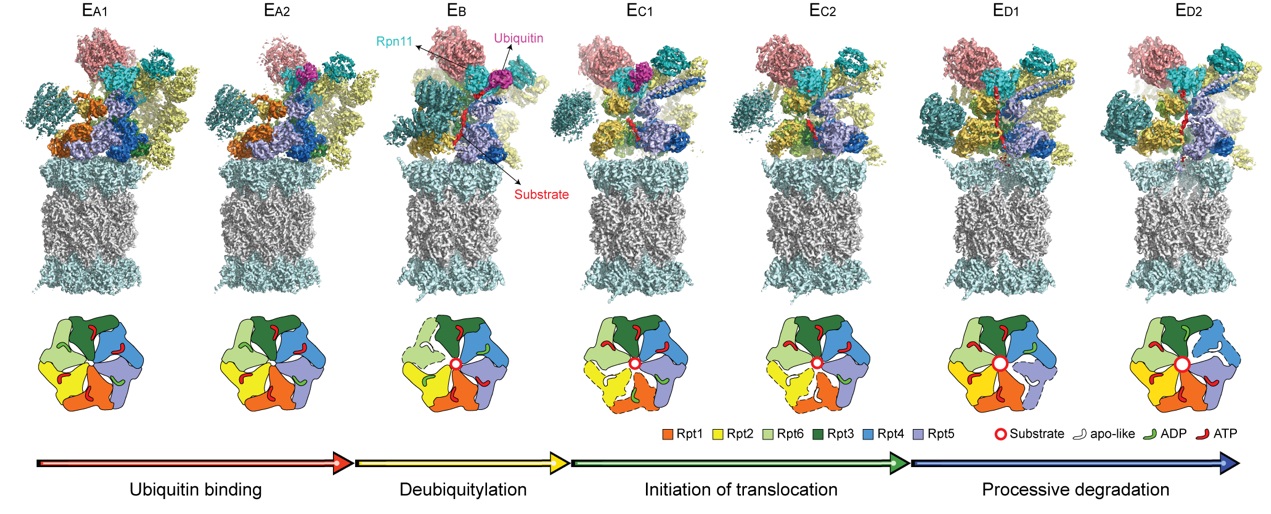 states),完整展示了蛋白酶体从泛素结合到去泛素化,再到底物转运的动态过程。与同期在Science上发表的与底物结合的酵母蛋白酶体的4.2-4.7埃冷冻电镜结构(Science