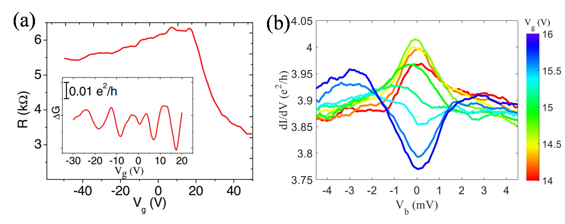 图1. Cd3As2纳米线中量子限制效应引起的电导振荡;(b)栅压调制的微分电导谱。