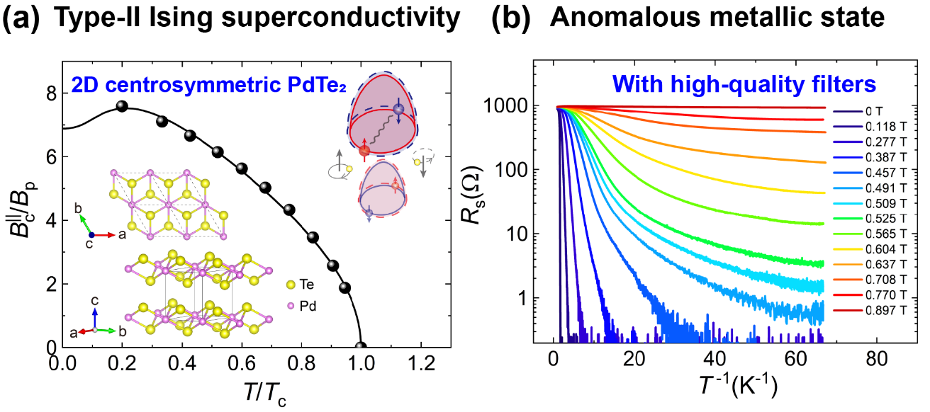 图(a) PdTe2薄膜的平行临界场随温度的变化关系符合伊辛超导的理论曲线。左下插图:PdTe2的晶格结构示意图,表明这是一种中心对称体系,不同于之前报道的伊辛超导体系。右上插图:第二类伊辛超导配对机制示意图。图(b) PdTe2薄膜不同磁场下方块电阻的对数(lgRS)随温度的倒数(1/T)的变化关系。随着温度降低,电阻先下降,然后逐渐趋于饱和,这是反常金属的典型特征。实验中使用了高质量滤波器排除了外界噪声对测量的影响。