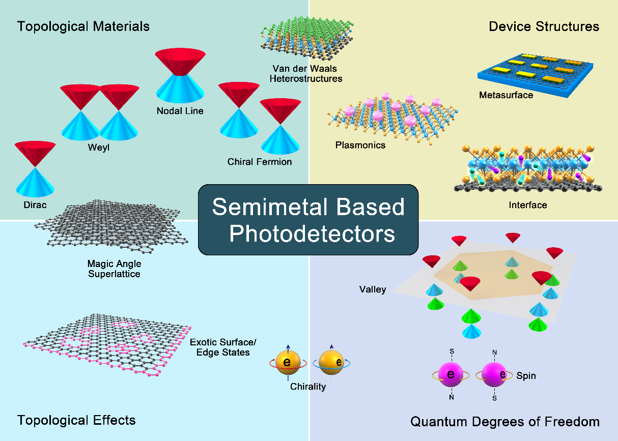 图二:基于半金属的光电探测器未来发展机遇。利用新的拓扑材料,设备结构,拓扑效应和量子自由度(从左到右,从上到下)进一步的提升基于半金属的光电探测器的性能。每个面板中均列出了可能的样例,其中一些样例放置在两个面板的边界以表示联合可能性。