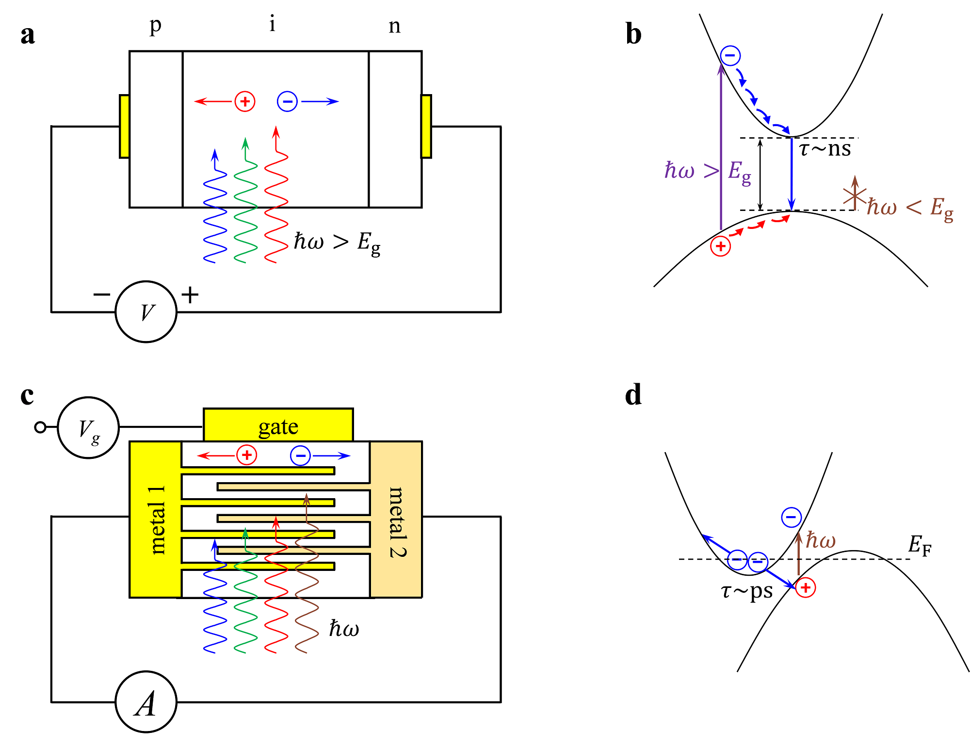 图一:半导体vs.半金属光电探测。a.偏置条件下的半导体PIN探测器,只有当光子能量大于带隙时光子可以被吸收并被探测到。b.半导体材料中光生载流子的产生和复合。典型的电子空穴复合时间在纳秒量级。c.基于半金属的无偏置插指电极探测器。因为没有带隙,对于吸收和探测光的波长没有限制。D.半金属材料中光生载流子的产生和复合。因为可以通过电子电子散射复合,典型的复合时间在皮秒量级。