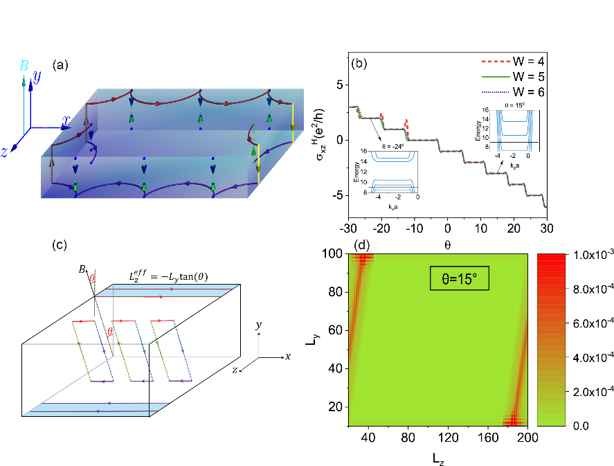 图:(a)边缘态的物理图像;(b)霍尔电导对磁场倾角的依赖;(c)内禀电导所对应的边缘态的示意图;(d)边缘态局域态密度的分布。
