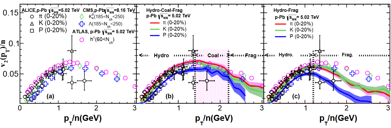 图1. (左图)CMS、ATLAS和ALICE等大型国际合作组在5.02TeV p-Pb碰撞小系统高多重数事件中观测到的椭圆流准价夸克标度率;(中图)流体-重组合-碎裂模型的计算结果与实验结果比较;(右图)流体-弦碎裂模型的计算结果与实验结果比较。