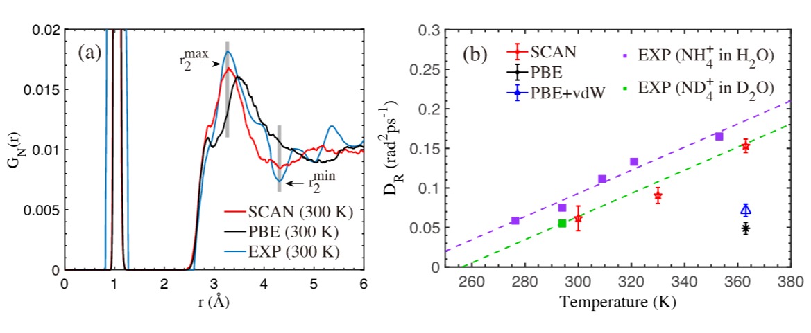 图2. 计算模拟结果与实验结果的对比。(a)氮-水分子的总分布函数GN,蓝色的实线是中子散射实验的结果,灰色的竖线标定了实验中GN第二个峰和第二个谷的位置。(b)氨根离子在水溶液中的旋转扩散系数,实验与模拟结果的对比。实验数据来源【Chem. Phys. Lett. 84,425 (1981); JACS 108,1088(1986)】