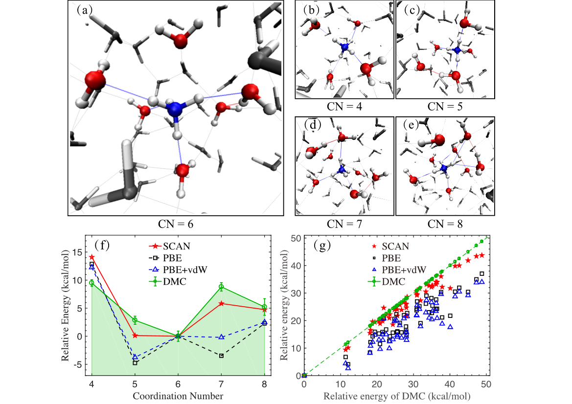 图1. 不同DFT泛函和DMC结果的对比。(a)-(e)具有不同配位数(CN)的典型构型。(f)对于CN为5到8的构型采用不同方法计算的相对能量。(g)对于气相NH4+水分子团簇的构型采用不同方法计算出来的相对能量。气相NH4+水分子团簇的构型是从NH4+水溶液AIMD轨迹中随机挑选出来的,包括了气相NH4+和最近邻的8个水分子。SCAN,PBE,PBE+vdW为三种DFT泛函。